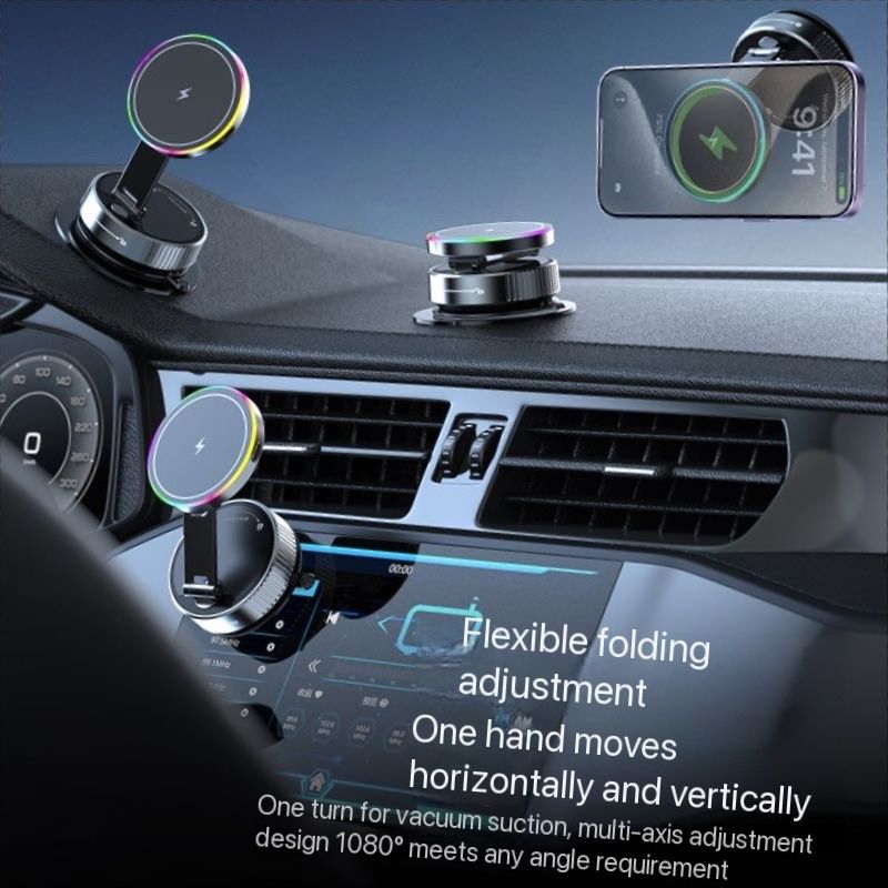 A premium car mount with advanced bionic suction cup technology and vacuum pumping for ultra-secure fixation. Features built-in fast wireless charging, ensuring your phone stays powered and firmly in place while you drive.